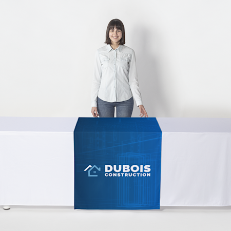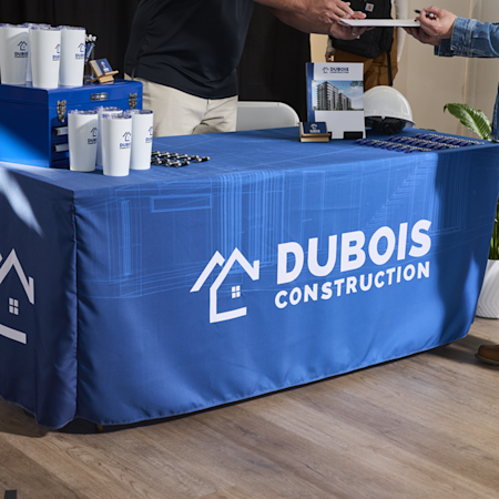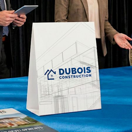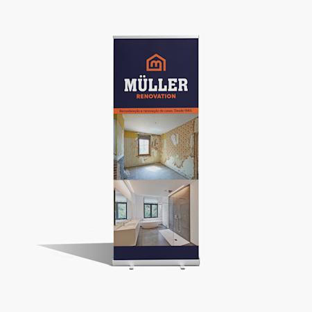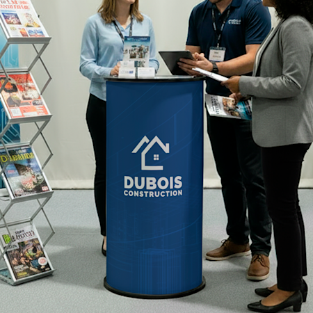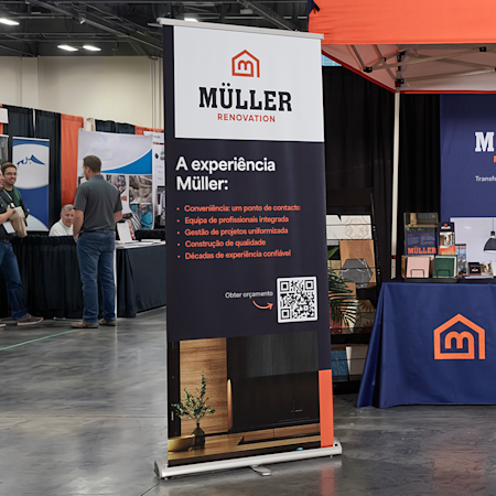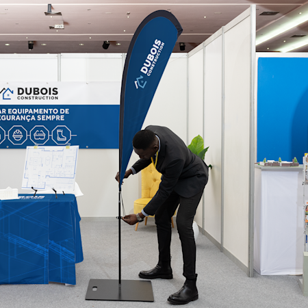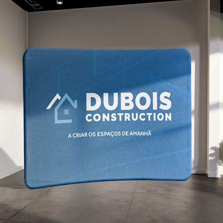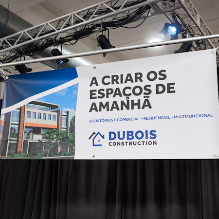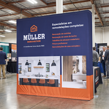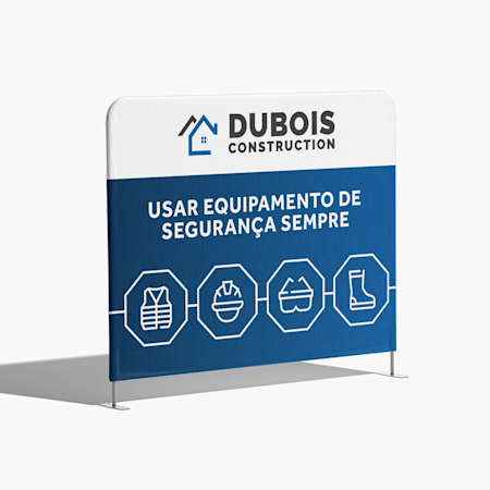 - Destaque-se com backdrops personalizados e produtos publicitários para mesas, como roll ups de mesa