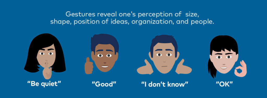 Os gestos demonstram as perceções que as pessoas têm dos tamanhos, das formas, das posições relativas e de grupos de ideias, organizações e pessoas.