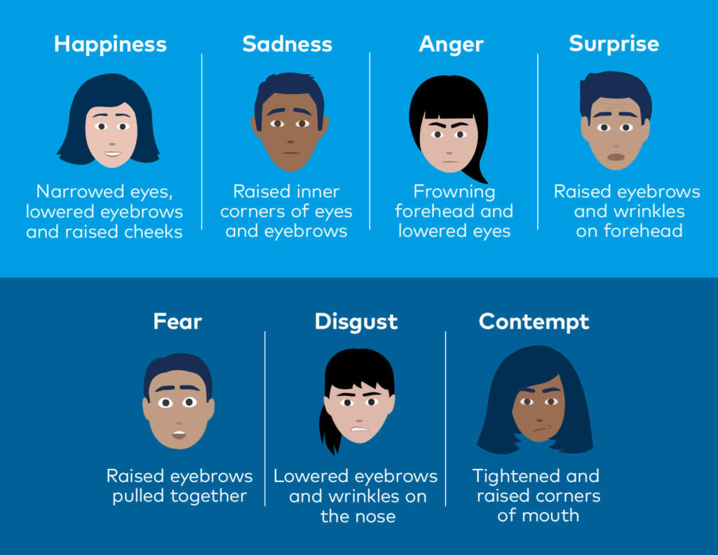 As sete expressões emocionais básicas reconhecidas pela maioria das culturas são felicidade, tristeza, raiva, surpresa, medo, nojo e desdém.