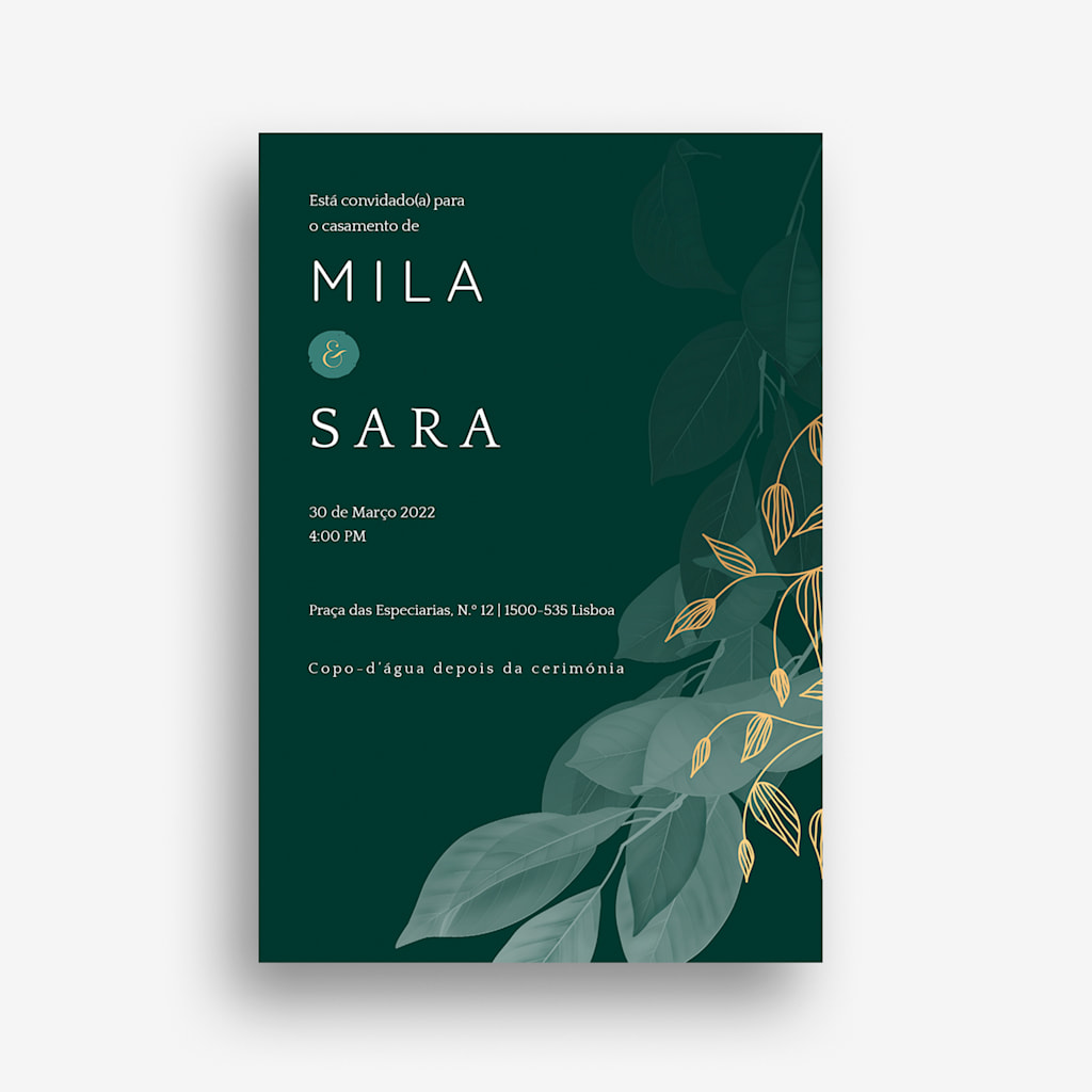 À medida que o dia do casamento se aproxima, é altura de enviar os convites formais, idealmente 6 a 8 semanas antes do evento. Os convites devem indicar o local e a hora da cerimónia e do copo-d’água, bem como uma data-limite para os convidados responderem através do web site ou de um cartão de confirmação de presença. Resta pouco tempo? Optem por enviar convites eletrónicos caso tenha menos de 4 semanas até ao dia do casamento.