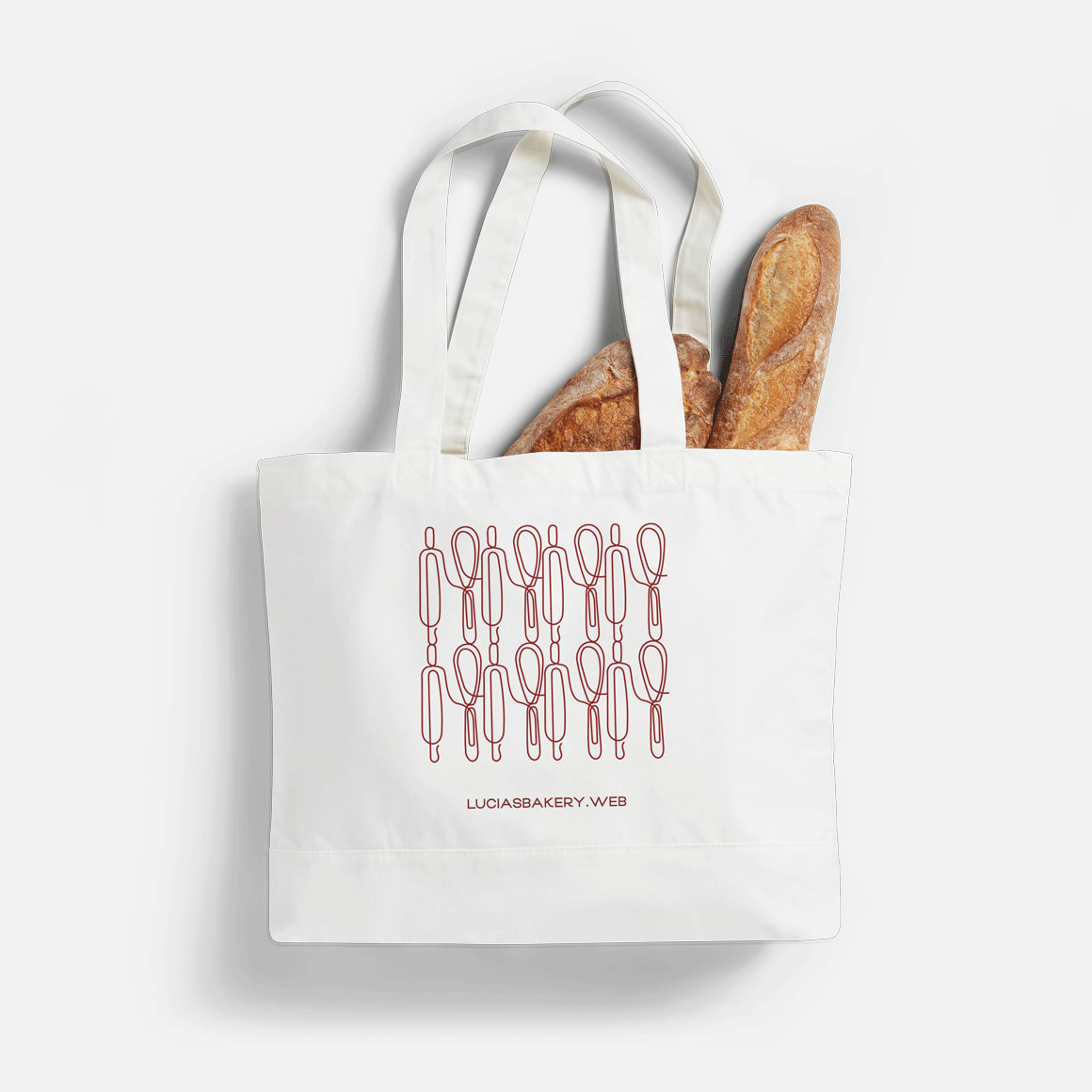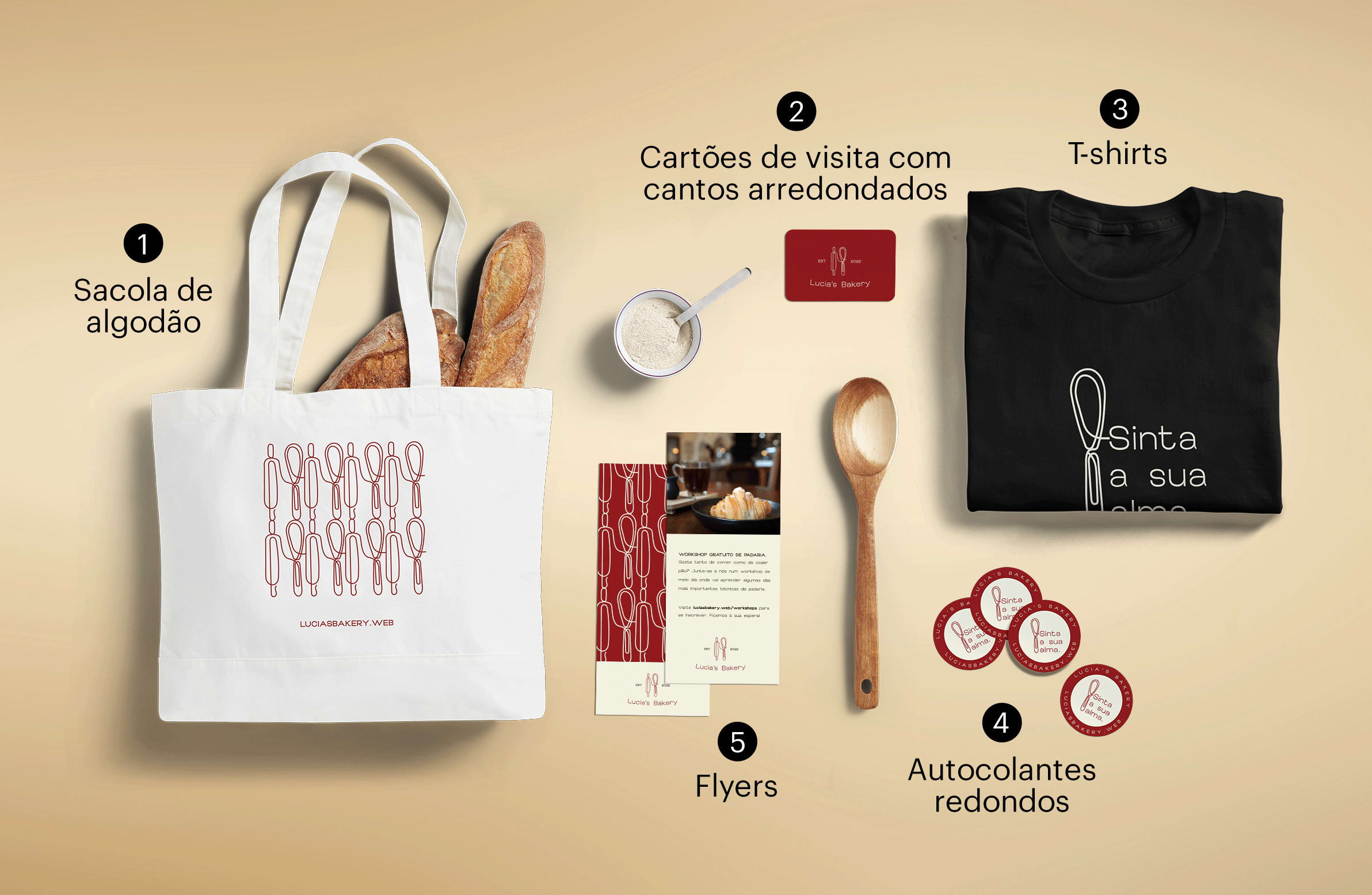 Sempre que utiliza artigos de merchandising como ferramenta de marketing, estes devem despertar nos clientes a vontade de os exibir e comprar. Pode ter na sua loja um stock completo de t-shirts e sacos de pano da marca, mas se não forem esteticamente apelativos, os seus clientes não estarão interessados. Nesta imagem, pode ver de que forma a marca Lucia’s Bakery transformou o design um pouco antiquado do seu logótipo num padrão apelativo e de elevado contraste que faz com que os sacos de pano e as t-shirts se destaquem. Decidiram também apresentar a marca de forma mais subtil nestes artigos de uso pessoal: o URL do web site surge num tipo de letra mais pequeno na parte inferior do saco, e o logótipo está impresso na parte de trás da t-shirt em vez de aparecer na frente.