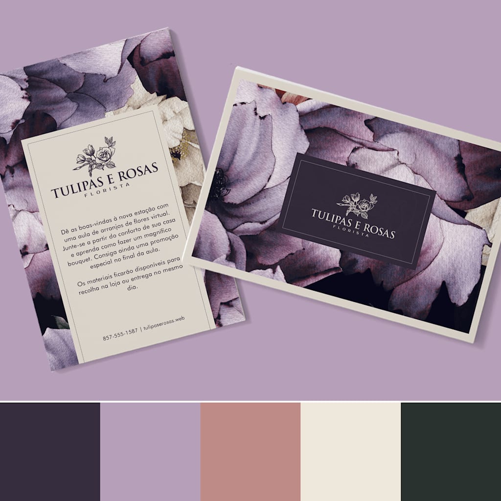 A paleta de cores da Tulipas & Rosas usa tons de rosa e roxo que parecem românticos e etéreos, enquanto toques de creme e preto estrategicamente colocados adicionam contraste apelativo. A utilização de cinco tons chave permite-lhes brincar com combinações de cores para dar um visual diferente a cada material com a marca… sem afetar a sensação global da marca. Aqui, veja como a Tulipas & Rosas consegue variar as cores que utiliza no texto do seu logótipo com base na cor de fundo — cor creme em roxo-escuro, roxo-escuro em roxo-claro e muito mais.