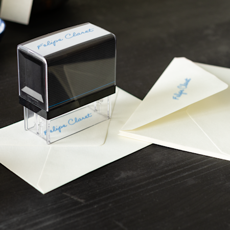 Tanto os carimbos autotintados como os carimbos de bolso têm espaço para 2 a 3 linhas de texto, o que lhe permite adicionar um nome e um endereço de retorno sem problemas. Se quiser adicionar um elemento de design ao carimbo, recomendamos que opte pelo carimbo autotintado. Os nossos carimbos de assinatura foram concebidos de modo a acomodarem uma réplica de 57 x 21 mm da sua caligrafia.