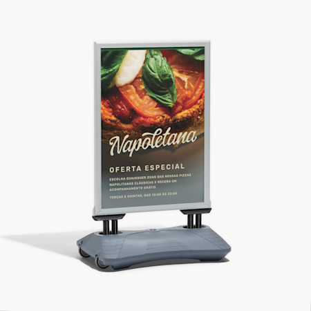 As nossas opções de publicidade exterior para empresas são fabricadas com materiais resistentes ao vento e às intempéries, mais robustos e visualmente marcantes, que permitem chamar a atenção para rulotes de comida, esplanadas, mercados de rua, parques de estacionamento e muito mais. Basta escolher o tipo de publicidade exterior personalizada e o modelo de que necessita e, em seguida, carregar o seu próprio design ou escolher um da nossa vasta biblioteca. Tanto a nossa equipa de designers especializados como a equipa de serviço de apoio ao cliente estão disponíveis para ajudar no que for preciso. O seu produto será impresso a cores e entregue rapidamente para poder começar a divulgar a sua mensagem sem demora.