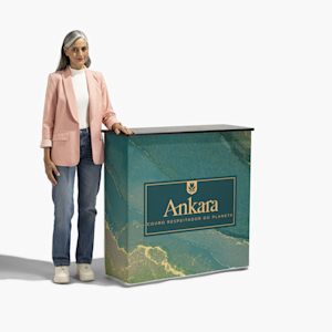 Pode adaptar o balcão para condizer com o estilo da sua empresa. A estrutura de alumínio dobrável é leve e resistente. O painel de tecido em poliéster é preso com cantos de silicone, o que permite trocar facilmente os grafismos para diferentes eventos. Quando terminar, o balcão arruma-se perfeitamente num estojo com rodas, para transporte e armazenagem simples.Personalize e crie sem dificuldade